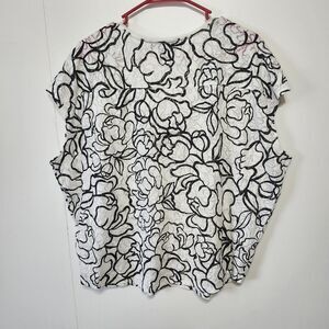 White House Black Market Floral V-Neck Top Women XL Black White Short Sleeve