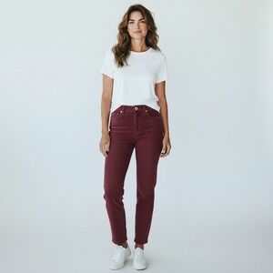 Keywords: burgundy jeans, high rise, skinny denim, women's pants, fall fashion, winter style, casual wear, smart casual, versatile, comfortable fit, flattering silhouette, everyday essential