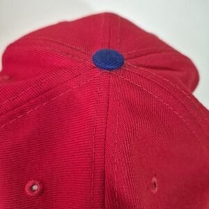 Red crown, blue brim, blue top button, red eyelets, black underbrim.