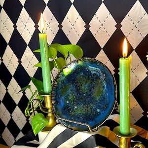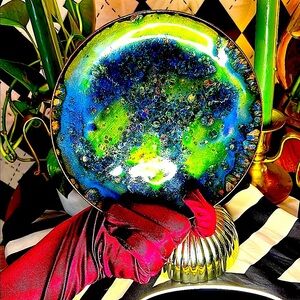A stunning, one-of-a-kind copper enamel art plate bursting with vivid, layered color and mid-century flair. Each plate in this curated collection is uniquely hand-fired, resulting in mesmerizing tones and abstract, painterly effects that make every piece feel like its own miniature artwork.