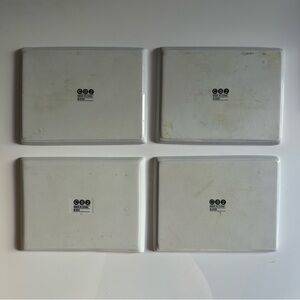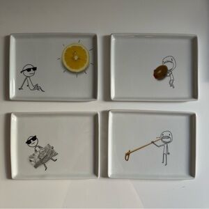 Set of four white rectangular plates with playful cartoon designs. Perfect for adding a fun touch to your dining experience.