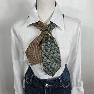 Upcycled Neck Tie /Scarf Vtg Flower Brooch Geometric Office Siren