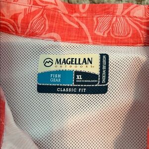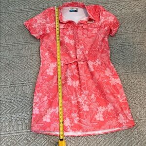 Stylish coral midi dress with floral pattern. Short sleeves and button-up front. Perfect for casual outings.