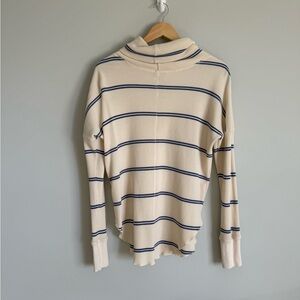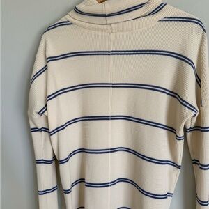 Elegant cream sweater with blue stripes. Features a cozy turtleneck. Ideal for casual wear.