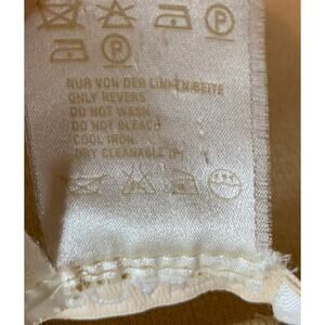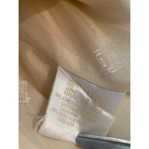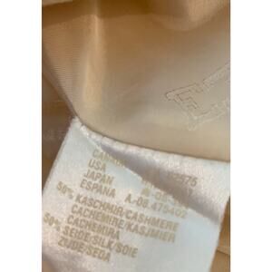 Margaretha Ley Cream blazer is Silk/Cashmere, good pre-owned condition There are a couple tiny pin dot marks on the front of unknown origin. Gold buttons, faux pockets on blazer.