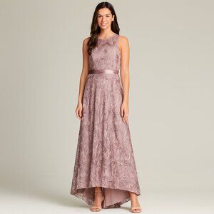Make an unforgettable entrance in this stunning New With Tags Tahari Arthur S. Levine sleeveless gown, perfect for weddings, galas, or evening events. Crafted in a romantic lavender hue, this floor-length dress features intricate swirling lace embroidery over a sheer overlay, a satin waistband for flattering definition, and full lining for comfort and coverage. The high-low hemline adds graceful movement, with a front length of approximately 58" and back length of 60.5". Bust measures approx. 16.5" armpit to armpit. Sophisticated, feminine, and timeless—this piece is a showstopper.