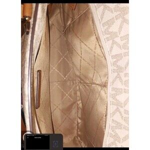 Hardware: Polished gold-tone with MK logo lettering- Features: 2 exterior side slip pockets, and multiple interior organizer pocket-Approx. 14.5" W x 11.5" H x 5.5" D