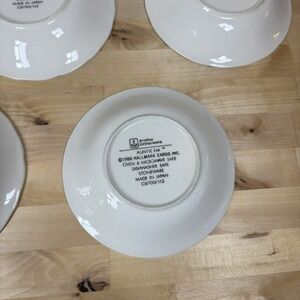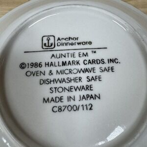 The product is a set of 5 round 7.75" coupe soup bowls by Anchor Hocking, manufactured in 1986. The pattern is "Auntie Em" featuring cream with blue trim, made of stoneware and suitable for all occasions. These vintage soup bowls are oven, microwave, and dishwasher safe, with a glossy finish and production style of stoneware. The bowls were made especially for Hallmark Cards, adding a touch of nostalgia to your table setting.