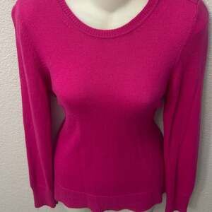 Gap pink long sleeve knit sweater, vibrant fuchsia color, women's size Medium. This classic crewneck sweater features a unique three-button detail on the left shoulder for a polished look.