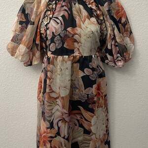 Entro Charcoal Floral Puff Sleeve Mini Dress, Women's Size M. This feminine dress features a bold charcoal-based floral print with earthy orange and cream tones. Highlights include dramatic puff sleeves, a ruffled neckline, and a flattering empire waist with a lightweight, flowing skirt. Perfect for brunch, weddings, or a date night. Excellent pre-owned condition with no stains, rips, or signs of wear.