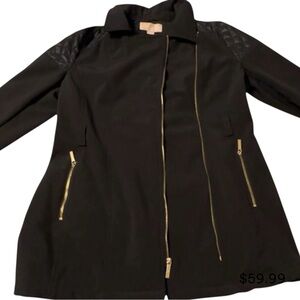 Michael Michael Kors black moto-inspired softshell jacket with sleek gold-tone hardware and a tailored, flattering silhouette. Features an asymmetrical zip front and quilted shoulder panels for a modern, polished look.