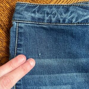This is a pair of just float on super flare denim blue jeans by Free People in a size 26. Zip and button closure. High rise. Frayed distressed hems. Stretch. Cotton, rayon, polyester, spandex. Machine wash. Two back pockets. Please note the tiny nubby bit of denim on the front. These are perfect retro 70s inspired style for a festival or whatever you choose to wear them to.