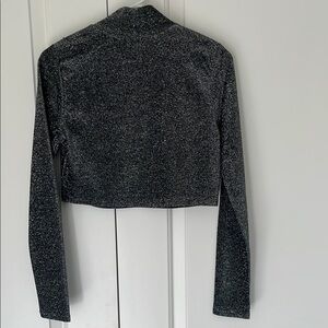 This stylish top features a sleek, fitted silhouette with a trendy cropped design. The long sleeves and high neckline add a touch of sophistication, but the sparkles make it fun!