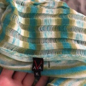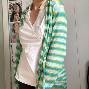 Introducing the AVA Cardigan in green and white stripes, size L. This stylish cardigan is perfect for adding a pop of color and pattern to your wardrobe. Gently used and in excellent condition, it offers both comfort and elegance, making it a versatile piece for any occasion. Its soft fabric and classic design ensure you'll look chic whether dressing up or down. Don’t miss the chance to own this charming cardigan!