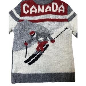 The Kids Canadiana Knit Full Zip Sweater in Child Size Small featuring a cozy Shawl Collar design, perfect for cold winter days in Canada. Made from a blend of nylon, acrylic, and wool, this sweater is machine washable for easy care. The Ski Canada theme adds a fun and stylish touch to this cardigan, ideal for both boys and girls looking to stay warm and fashionable during the winter season. Gently worn. No signs of wear. Smoke-free, pet-free home.