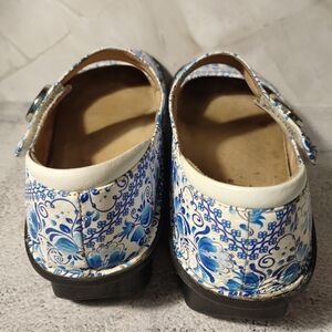 Charming floral Mary Jane platforms by Alegria. Features a white base with blue floral patterns. Stylish and comfortable.