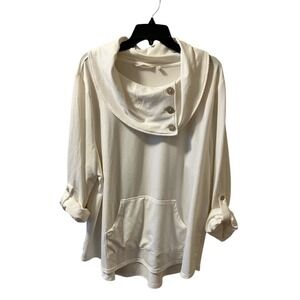 Ivory cream pullover tunic from Soft Surroundings. Women's plus size 2X in a relaxed fit. Features a cowl neck, accent buttons, roll tap sleeves and kangaroo pocket. In EUC with no stains or flaws found. Great neutral or capsule wardrobe piece. Measures 27" pit to pit and 31" in length.