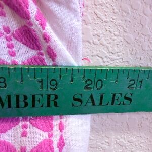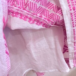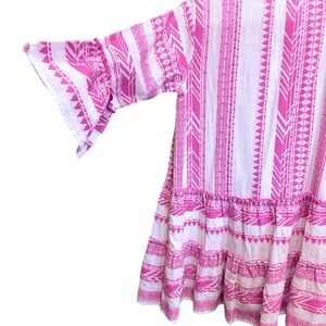Vibrant pink and white dress with playful embroidered pattern and drop waist. Features ruffled 3/4 sleeves and a comfortable flowy fit. Ideal for your spring vacation or cruise wear.