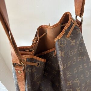 Elegant Louis Vuitton bag with iconic monogram. Features rich brown leather trim and adjustable straps.