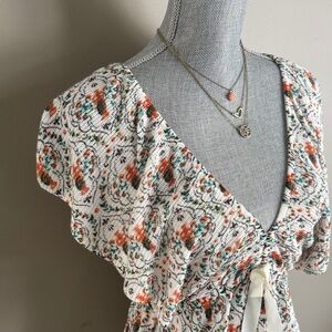 Elevate your style with this chic Anthropology floral print top. Featuring a flattering V-neck and a stylish tie detail, this top is perfect for any occasion. The vibrant orange and green hues add a pop of color to your wardrobe. Size Small
