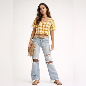 Vintage yellow and white crochet top. Floral pattern. Open weave. Short sleeves. Variation in color of yellow thread in some spots. Estimated size small based on measurements.