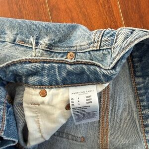 Casual light blue denim ripped jeans. Features classic stitching and button details. Short length.