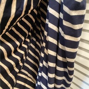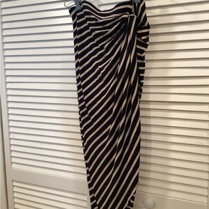 Asymmetrical stripes gathered on the side of a flowing, silhouette, navy and beige cream stripes
