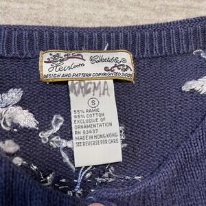 This vintage embroidered navy cardigan sweater is a charming addition to any wardrobe, with a floral pattern and bead accents that evoke a cottagecore or grandma aesthetic. The long sleeves, round neckline, and button closure make it versatile for various occasions, from casual outings to workwear or parties. Made from a Ramie and cotton blend, this knit sweater in size small features a regular fit and is suitable for all seasons, making it a timeless classic piece from the brand Heirloom Collectibles. Perfect for adding a touch of retro flair to your look.