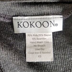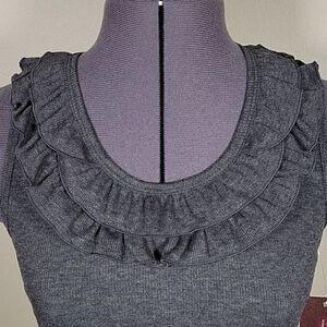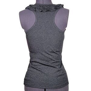 This ribbed knit tank top from Kokoon has a racerback and ruffled scoop neck. Content: 70% polyester, 25% rayon, 5% spandex. Care: hand wash, line dry.