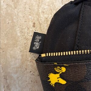 This is a NWOT (new without tags) Coach Large Corner Zip Wristlet in Brown Coach Signature Coated Canvas featuring Woodstock from Peanuts.