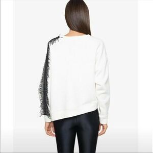 White pullover crew neck sweatshirt with black eyelash fringe, one sleeve is an oversized dolman, made by Koral Size Small (based on measurements was a sample and there is no size tag) Pit to pit 31" Sleeve length 24" Length 23"
