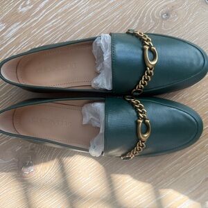 Coach leather loafers in beautiful green color with signature gold chain detail.