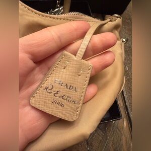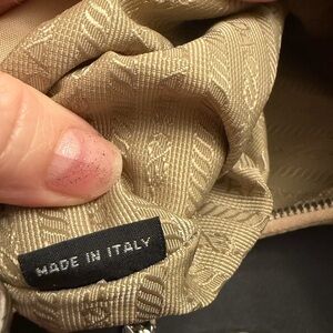 Chic Prada shoulder bag in beige. Features a stylish silver chain. Perfect for any occasion. This bag is multi functional. It can be used as crossbody, shoulder bag and converts to lovely croissant style design. It comes with 2 chain straps, to be used as crossbody or shoulder. The hooks are installed on bag for croissant design. It’s truly a lovely style and design, very versatile for any occasion. It’s made from soft nylon frantic in a beautiful neutral beige color, very easy to clean material.