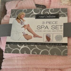 Indulge in luxury with this soft pink spa set. Includes a plush bathrobe, hair towel, and mesh sponge. Ideal for home spa days.