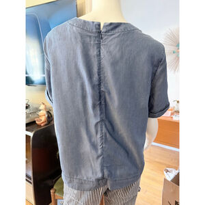 This is a pre-owned women's Armani Exchange short-sleeve top in a medium blue, denim-like fabric. The top features a round neckline with subtle pleating detail on the front shoulders and a short zipper closure at the back of the neck. The sleeves are cuffed, and the hem is straight. The care tag indicates it is 100% Tencel Lyocell and recommends hand washing. The size tag shows "L/G" for Large. No significant imperfections are visible.