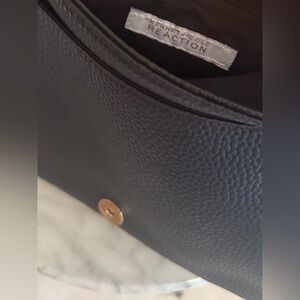 Kenneth Cole Reaction black pebbled crossbody saddle bag featuring a magnetic snap closure and gold-tone hardware. Bag is new without tags, with the original clear protective plastic still attached to the snap closure hardware, indicating it has not been used. Fast shipping!