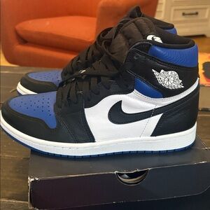 Bold high-top sneakers with a striking black and blue design. Features classic Nike Air branding.These are in mint condition
