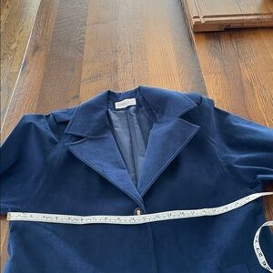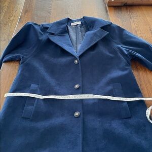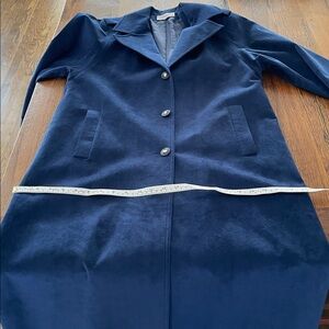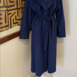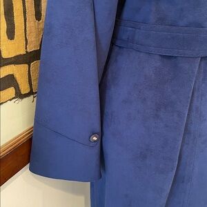 Step out in style with this long elegant and deep blue ultra suede coat. It has front pockets, detailed buttons and detached self belt. Perfect for any occasion, this coat offers both comfort and a pop of color. Excellent condition!