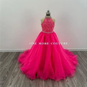 This stunning pink kids dress features a sparkling bodice, perfect for special occasions. The vibrant color and elegant design make it a standout choice.Long train very pretty on stage.