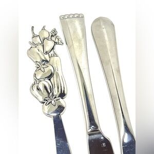 Three different stainless steel spreaders. Perfect for charcuterie boards or gifts. Ganz and Oneida. One vegetable theme spreader and two decorative spreaders to go with it in the set.