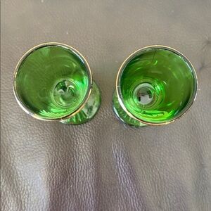 Vtg Slovic Moser Style Hand-Enameled Green Glass Cordial Goblets w/Gold Trim