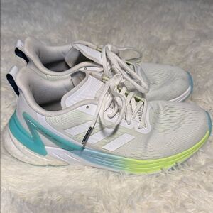 Stylish Adidas sneakers featuring a white base with vibrant green and blue accents. Ideal for casual wear and sports. Pet and smoke free home !