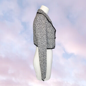 Vtg Vintage 90s Possessed Collared Corporate Goth Black and White Cropped Button Up Bolero Top. Cute formal piece that can be worn casually, or formal / business. Can be worn buttoned up, or left unbuttoned. Would be cute paired with high waisted pants, or a skirt. This piece has shoulder pads that can be removed as shown in photo 5. There is an inside hidden button that helps button up in the front, shown in photo 5 as well.