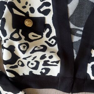 Chic blazer with bold black and white pattern. Features gold button accents. Ideal for a statement look.