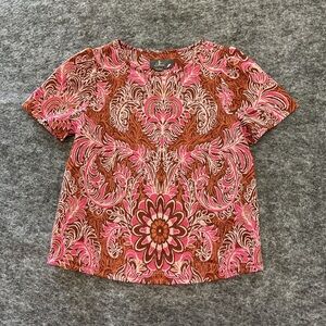 Chic short sleeve top with intricate floral design. Features vibrant pink and brown hues. Ideal for casual outings.