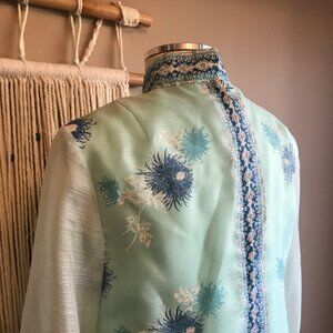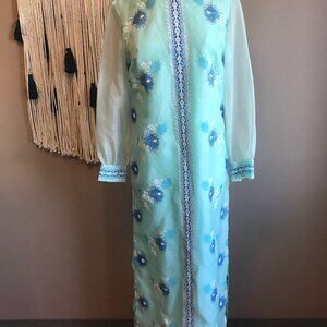 Vintage 1960s Alfred Shaheen dress in icy blue with a signature Shaheen floral print in blue, teal and white. This lovely dress is a Kaftan inspired, shift silhouette with a mandarin collar and long sheer sleeves cuffed with detail to match the trim down the front and back centre of the dress and across the collar. The dress is floor length, with side slits that end before the knee. The fabric is a polyester/ nylon blend with a beautiful shimmer. The dress is fully lined and finished with a back zipper.