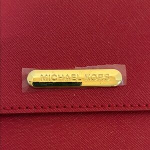 Elegant red wallet with gold-tone logo. Perfect for stylish outings. This is a Michael Kors red Saffiano leather wallet or clutch with a gold-tone logo plaque and magnetic snap closure.