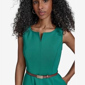 Chic midi scuba dress by Calvin Klein. Features a stylish belt and sleeveless fit and flare design. Perfect for versatile wear.