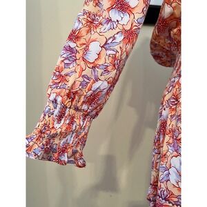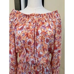 Capture playful elegance with this Poupette St Barth off-the-shoulder dress. Dainty flowers bloom across a vibrant peach and lavender canvas, creating a romantic, bohemian feel. The smocked bodice and waist cinch to flatter your figure, while the tiered ruffle skirt adds a touch of whimsical movement. Long, billowy sleeves with smocked cuffs and ruffled hems complete this enchanting piece, perfect for a sun-drenched brunch or a breezy beach vacation. Size tag missing, estimate as a medium. Please refer to measurements below. In excellent condition.