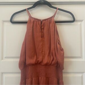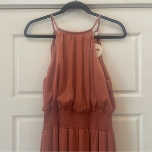 NWT She + Sky Midi Dress in Copper Size Medium. In perfect condition with no signs of flaws. Nice silky material and perfect for any occasion. Wedding guest, dinner date, brunch, and more. Has a button clasp on the back of the neck.